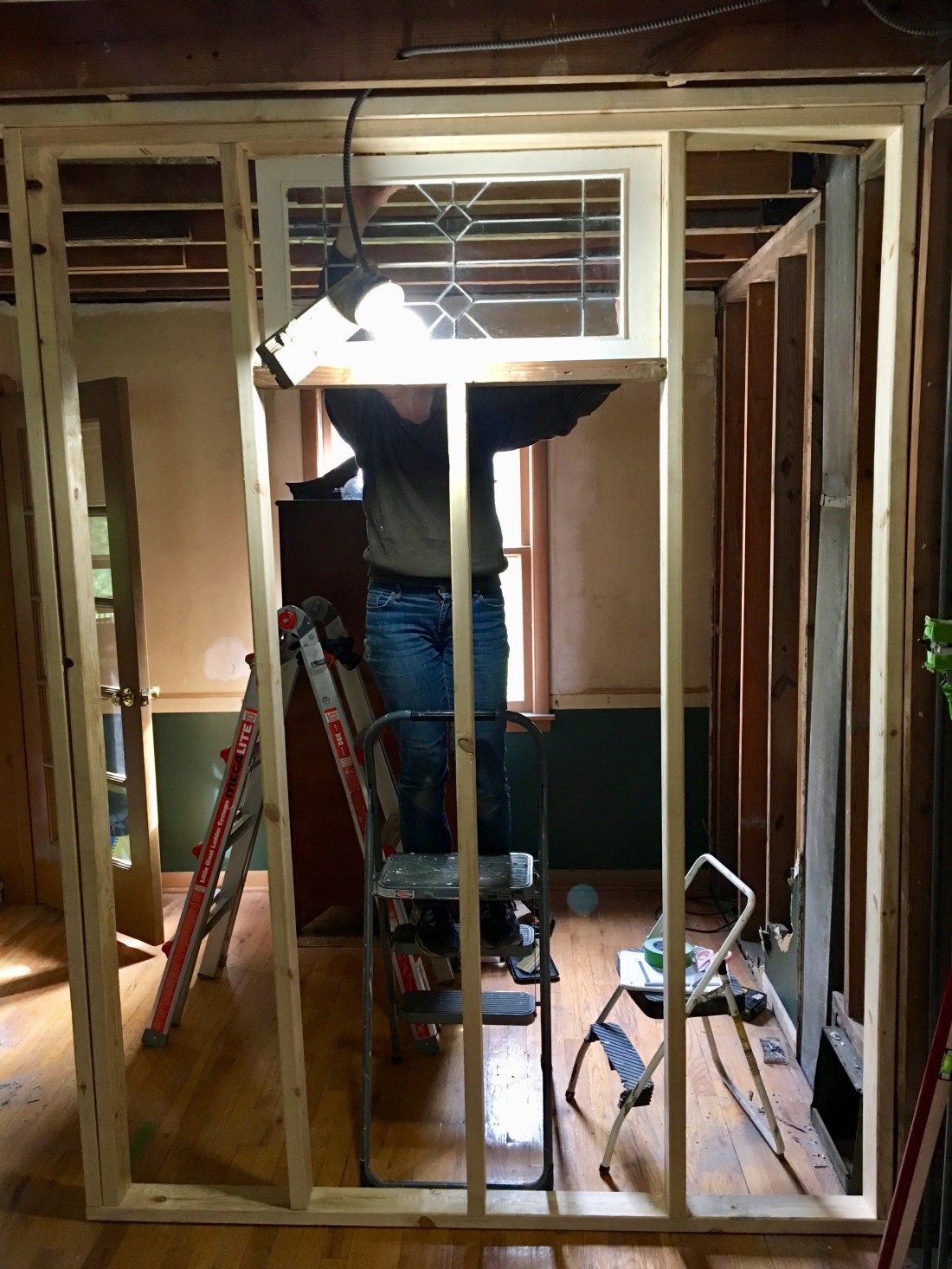 After we nailed the bathroom/rear kitchen wall into place into place my Mom was nice enough to hold enough to hold up the salvaged window that will be the transom window so that I could see what it will look like; eventually. Of course I did the same when she hopped off the ladder.